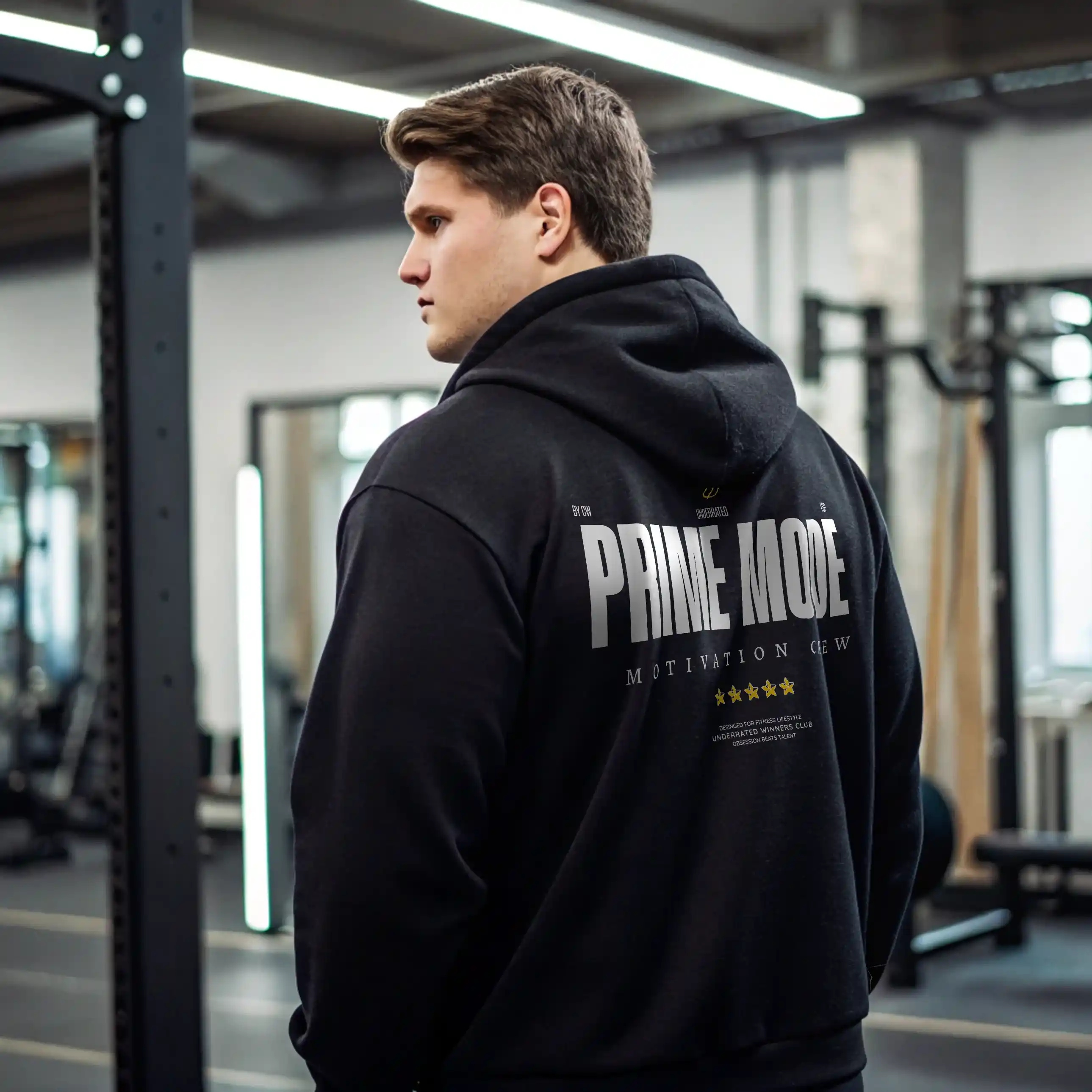 La sudadera gym PRIME MODE BLACK representa ese estado mental en el que te enfocas, te exiges y das lo máximo de ti, sin excusas.